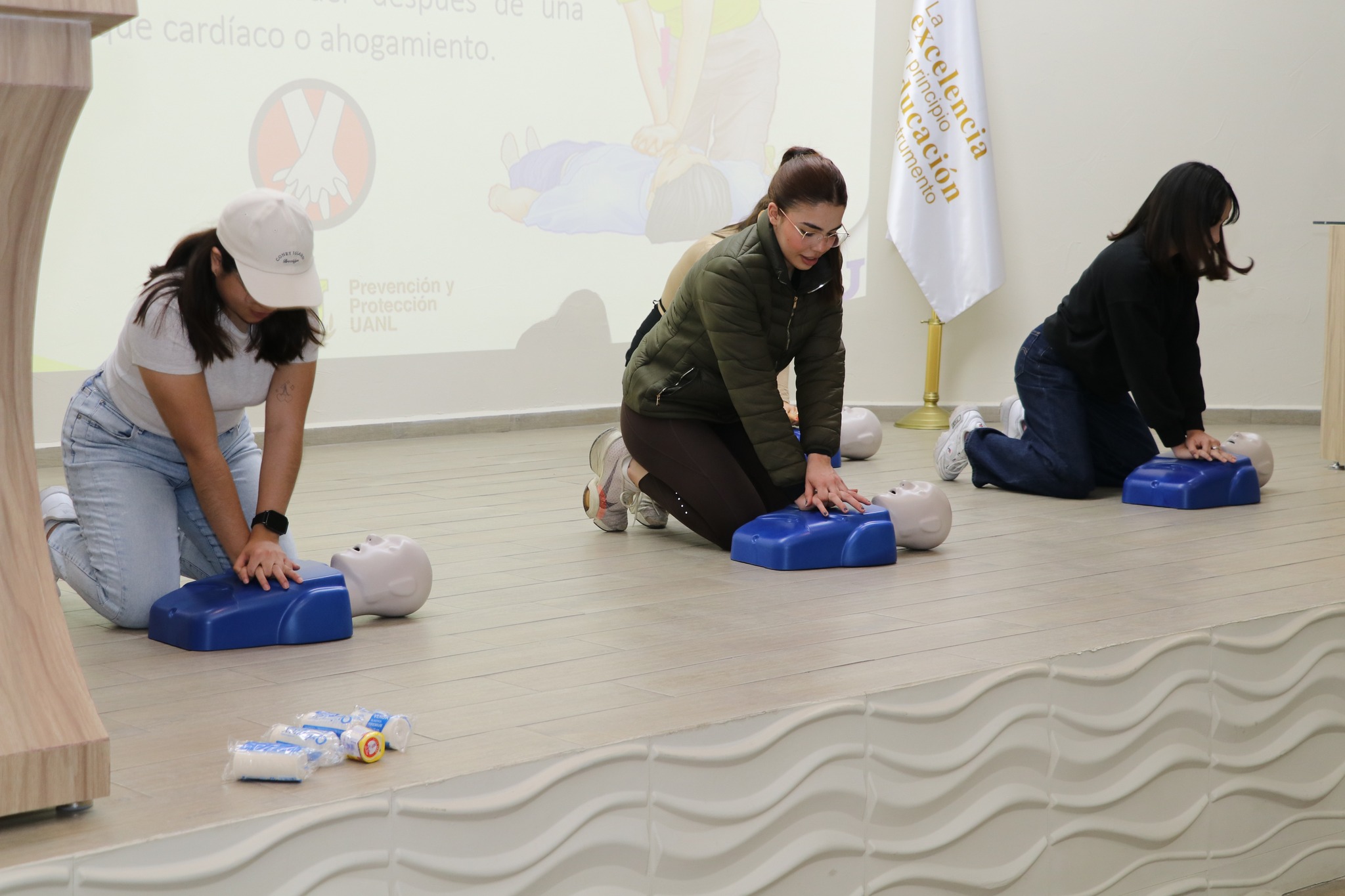 Durante la plática, algunos de los asistentes tuvieron la oportunidad de participar practicando técnicas básicas de primeros auxilios como la maniobra de heimlich y la reanimación cardiopulmonar (RCP).